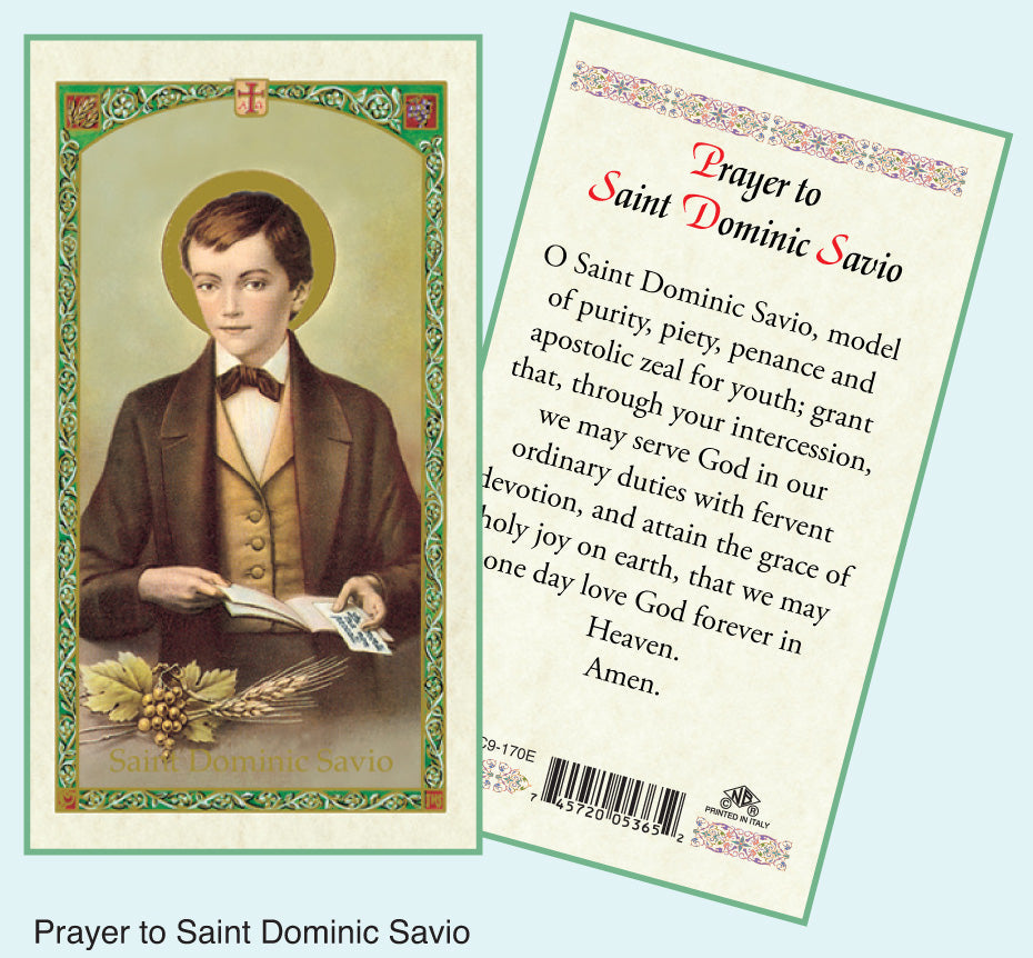 Experience the youthful piety of St. Dominic Savio with our cherished St. Dominic Savio prayer cards. Each card is thoughtfully designed to invoke the intercession and blessings of St. Dominic Savio, the patron saint of youth, students, and altar servers. Carry the essence of St. Dominic's virtuous life with you, drawing inspiration from his unwavering faith and commitment to holiness. These pocket-sized cards serve as a reminder of faith and provide solace and encouragement. Share these meaningful cards with others seeking spiritual enlightenment or keep them close for personal reflection. Experience the transformative influence of St. Dominic Savio's intercession and enhance your spiritual practice today.